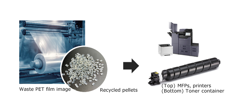 The parts to be converted this time include cases (toner containers) for filling toner, which is a consumable part of MFPs and printers. We aim to replace them with toner containers made from recycled materials. This upcycle will enable PET film to be reborn as a component for MFPs and printers without being discarded. In the future, we will expand the use of recycled materials not only for toner containers but also for internal and external parts, aiming to increase the use of recycled materials to 50% per product.