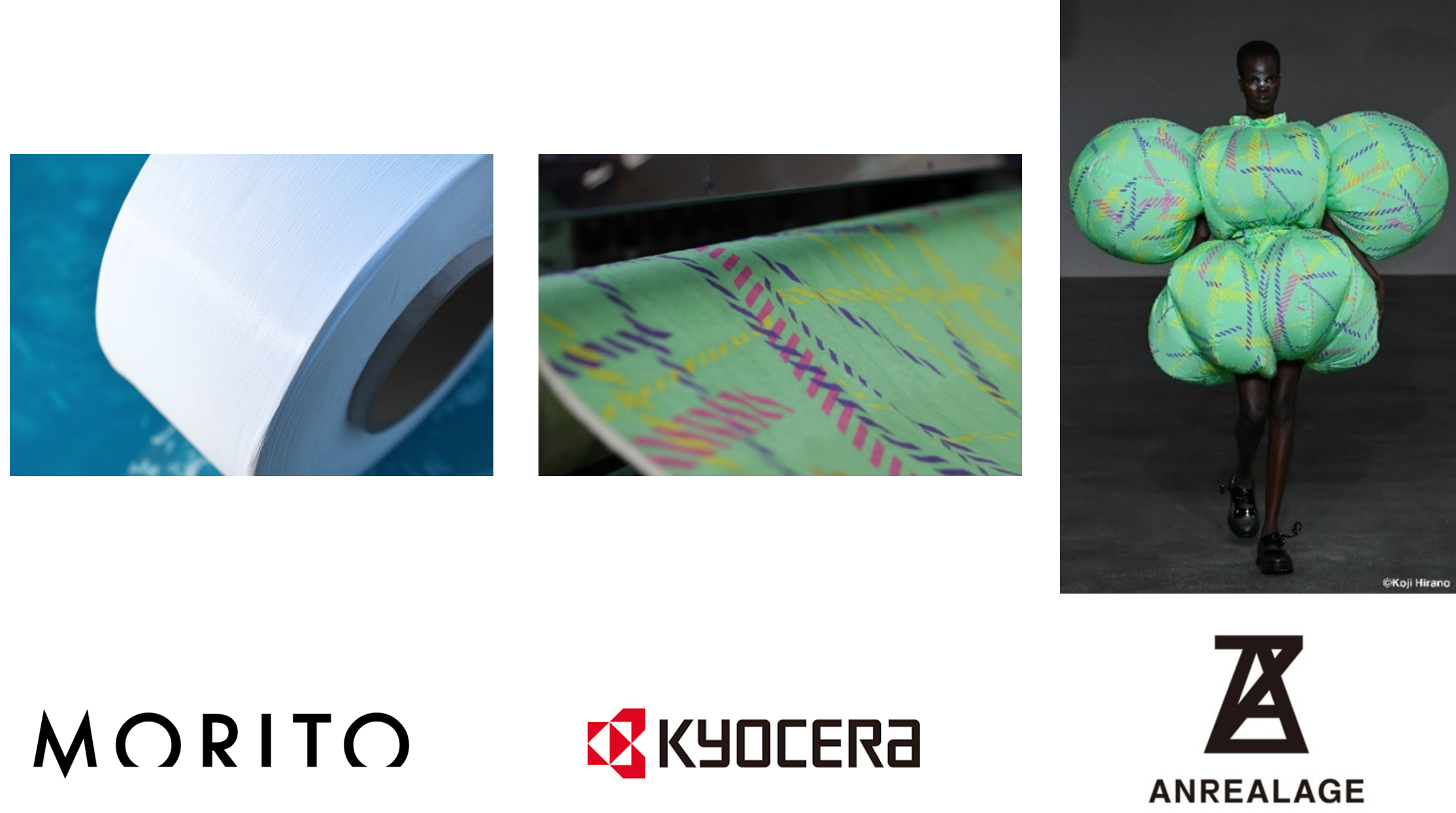 Kyocera Document Solutions Inc. (President: Hironori Ando) is pleased to announce that the fashion brand "ANREALAGE" has announced a collaboration item at the women's collection for Spring/Summer 2025 Paris Fashion Week®. The item was created with fabrics composed of "MURON" yarn made from recycled waste fishing nets, then printed on using Kyocera's inkjet textile printer "FOREARTH". MURON was developed by MORITO APPAREL CO., LTD. (President: Hiroyoshi Mori).