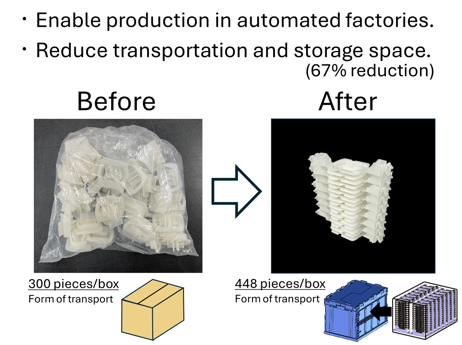 Joint parts can now be delivered to the factory stacked on top of each other, making it easier to remove parts. This allows assembly to be automated.