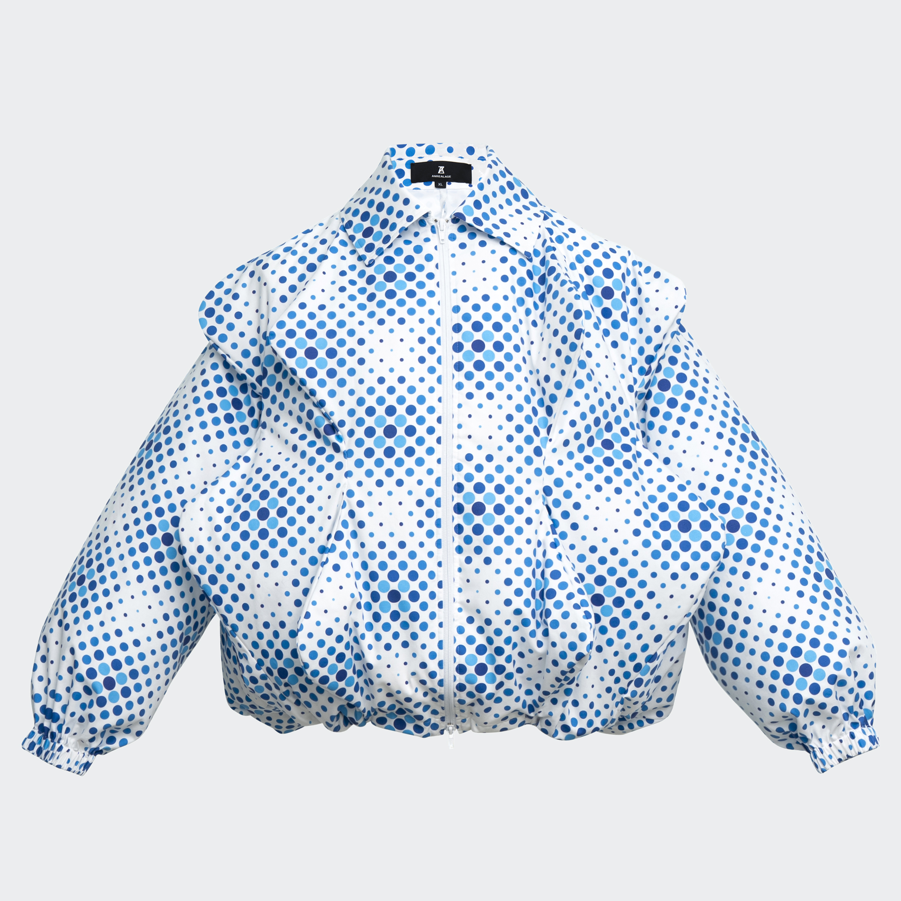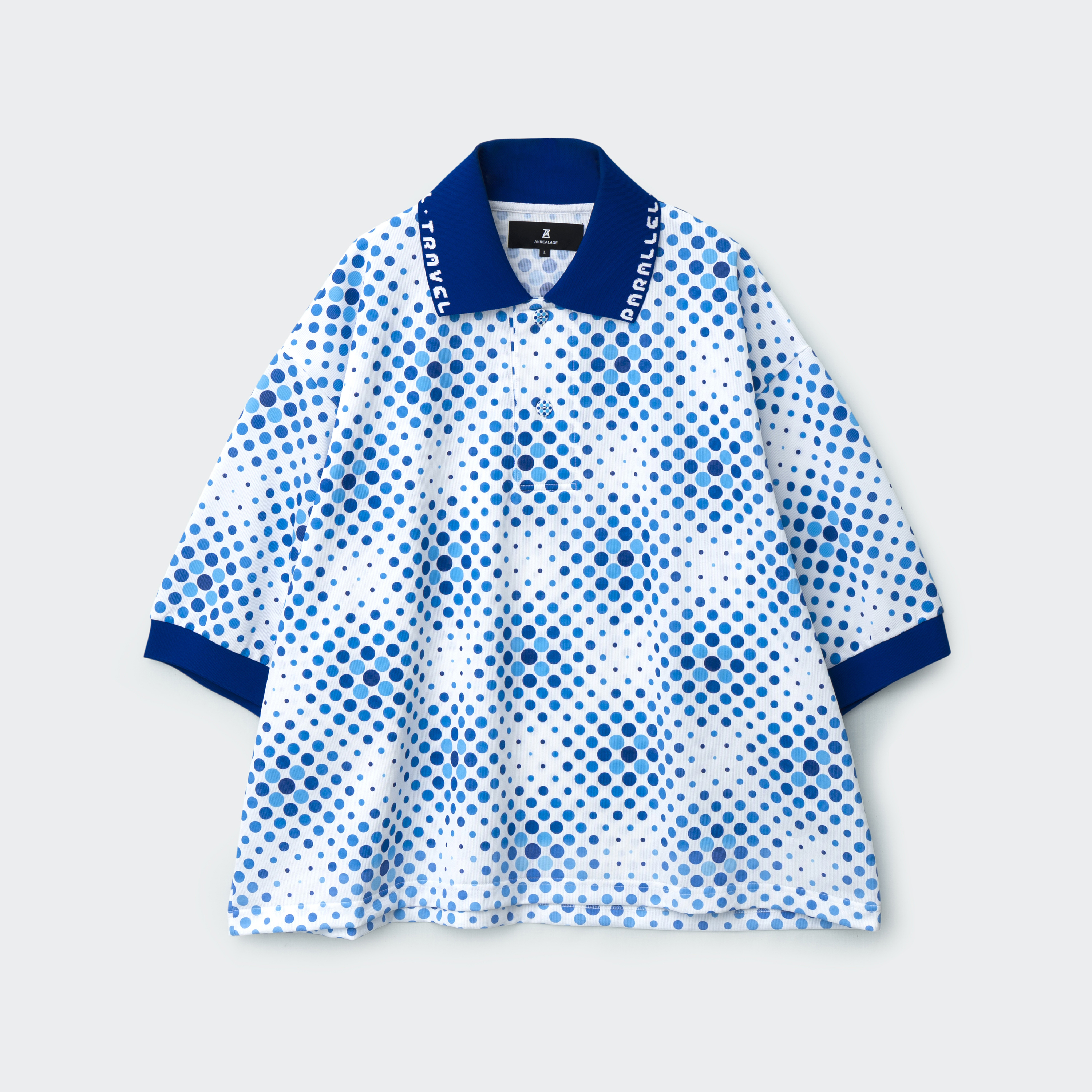 The outerwear is the cooling jacket that wears the wind. It provides the airflow between the body and the garment, creating an abstract silhouette that surpasses the human “form”. It connects people like a "cloud," and expresses connections that transcended boundaries within ambiguous outlines. As the wind flows enough through, the fabric drapes come out and gently transform to fix to the body shape of people. The inner polo shirt also reconstructs the silhouette and detail proportions to create a shape that can be worn regardless of gender or body type. The dot pattern expresses the gentle merging of dots of different sizes and colors, connecting into one beyond boundaries. The fabric features "AZEKⓇ*3 from SHIKIBO LTD. " which excels in breathability and quick-drying properties. Additionally, the outerwear is an "KUCHOFUKU*4" that incorporates an electric fan, providing functionality to cope with the summer heat.