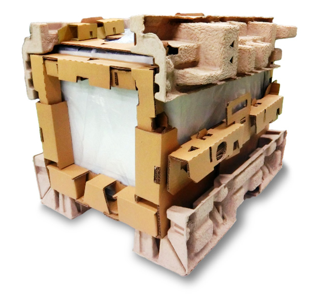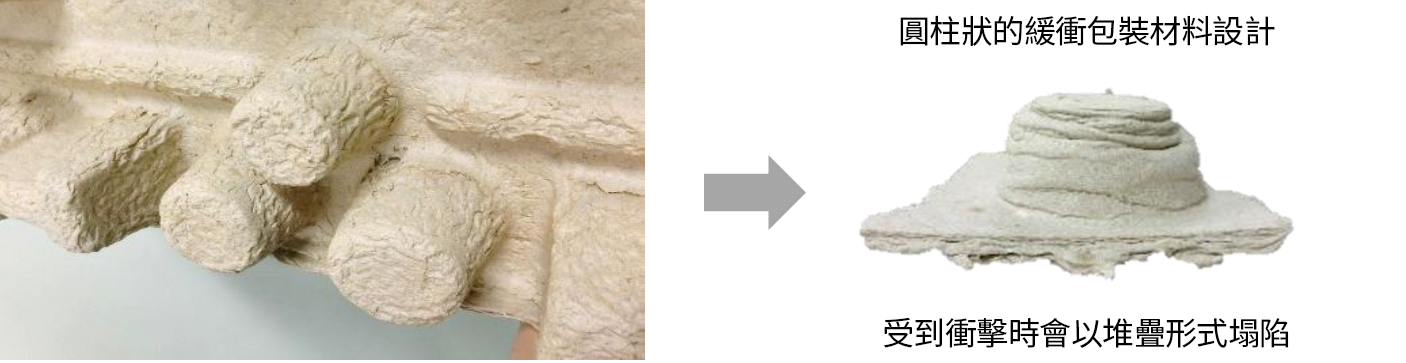 相較於塑料泡棉緩衝材,紙質緩衝材本身不具有彈性,在受到多次衝擊後容易導致緩衝效果降低。為了彌補紙質緩衝材的缺點,京瓷開發了特殊的紙漿模具,透過圓柱狀的設計,使緩衝材在受到衝擊時會塌陷成風箱狀以維持支撐能力,可防止翻倒和包裝破損,大幅提升紙質包材的重複抗衝擊能力。