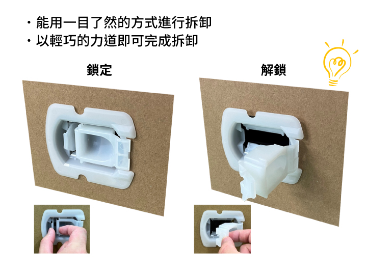新採用的連接件設計簡潔明了,使用戶能夠輕鬆理解如何進行拆卸。同時,加入了全新的機制,在確保鎖定功能的同時,僅需施加輕微的力道即可釋放鎖定狀態,從而顯著提升使用便利性。
