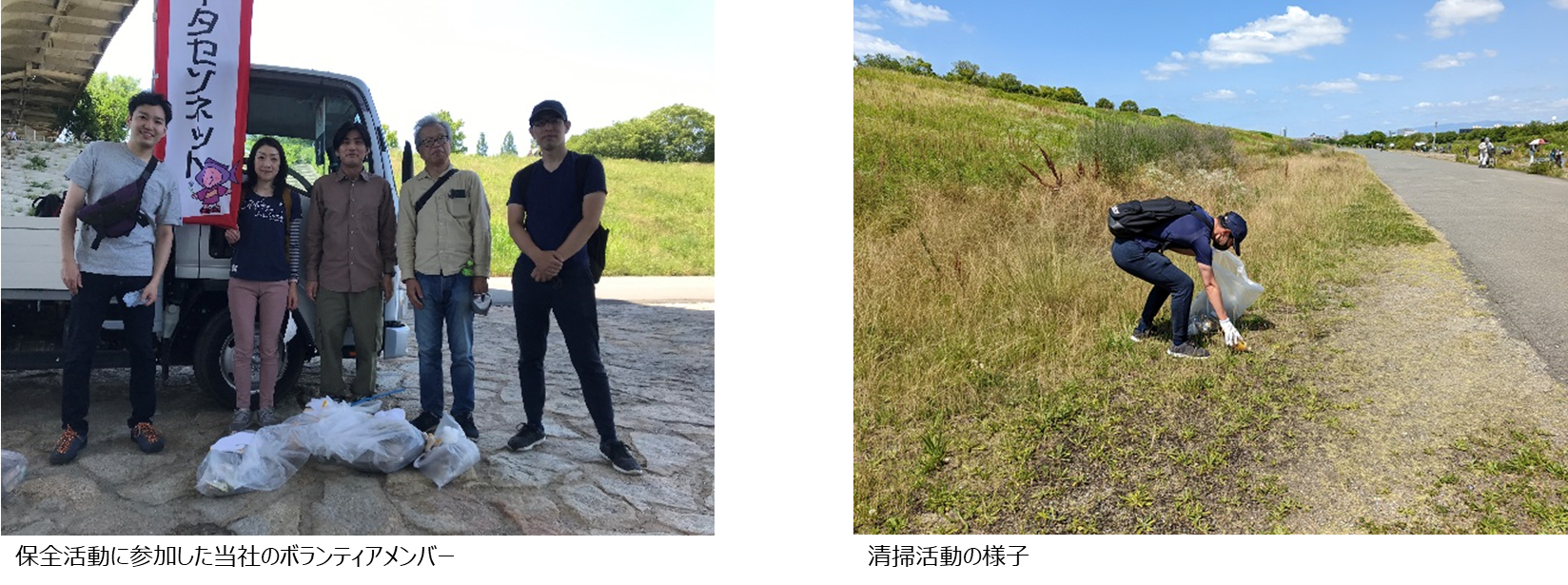 本年度から、当社の社員からボランティアを募り参加しました。今回の活動に参加したメンバーは河原の遊歩道の清掃を行うとともに、イタセンパラの稚魚を傷つけないように水際から離れた位置で網引きをし、外来種の駆除を行うなど淀川の生物多様性保全に貢献いたしました。活動の最後には、採取したブルーギルなどの外来種やナマズやオイカワなどの在来種の紹介を行い、城北ワンドの生態系への理解を深めました。なお、在来種については活動後、リリースしました。今後も当社は月1回の予定で本活動に参加してまいります。