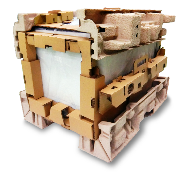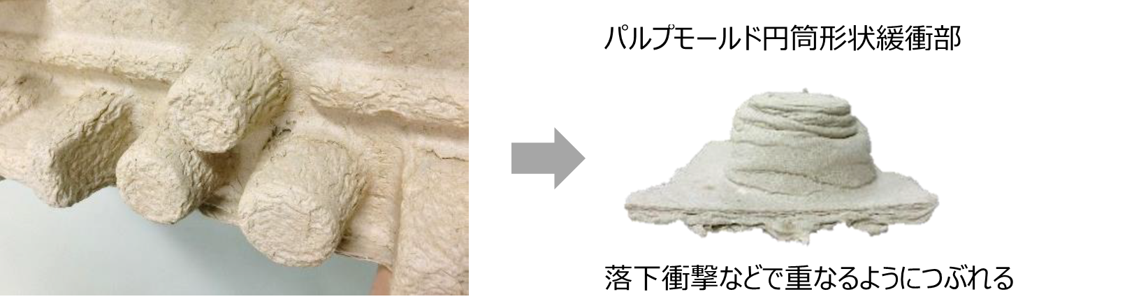 紙製緩衝材は、発泡の緩衝材と異なり復元力がないため、複数回の衝撃が加わることで緩衝性が低下します。そこで段ボール緩衝材には衝撃を受けると蛇腹状につぶれ緩衝材を支える形状や、パルプモールドには円筒形状を採用し倒れ折れを抑制など、紙の欠点を補う工夫を行い、繰返し緩衝性を向上させました。