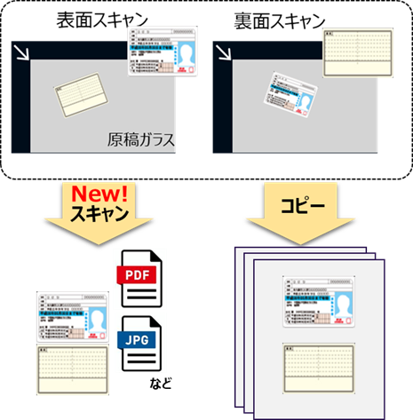従来のIDカードコピー機能をスキャンでもサポート。IDカードをスキャンする際、原稿台にカードを置く位置がずれてしまっても、読み取ったデータの傾きを自動補正し、1枚の用紙にカードの裏表を並べます。