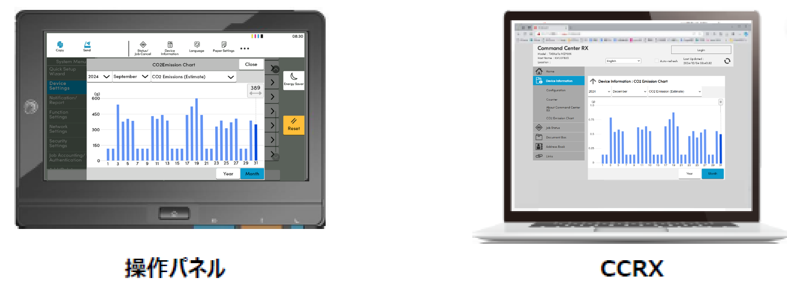 環境負荷低減の意識づけを目的とし、稼働中の消費電力量およびCO2排出量をグラフで表示することができます。操作パネルと複合機やプリンターの管理を行うためのWebベースの管理ツールCCRX(Command Center RX)での表示をサポートしています。