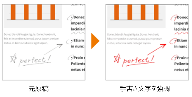 手書きの帳票や、アンケート、図面などに書かれた手書き文字をスキャンすると、文字が薄い、小さいなどで読みづらくなる場合があります。原稿を読み取る際に手書きの箇所を認識し、フォーマットや元の画像はそのままで、手書きの場所のみを強調して読みやすくしてスキャンすることが可能です。また、背景が白い原稿の場合は、手書き部分を白く上書きし、見えなくすることもできます。