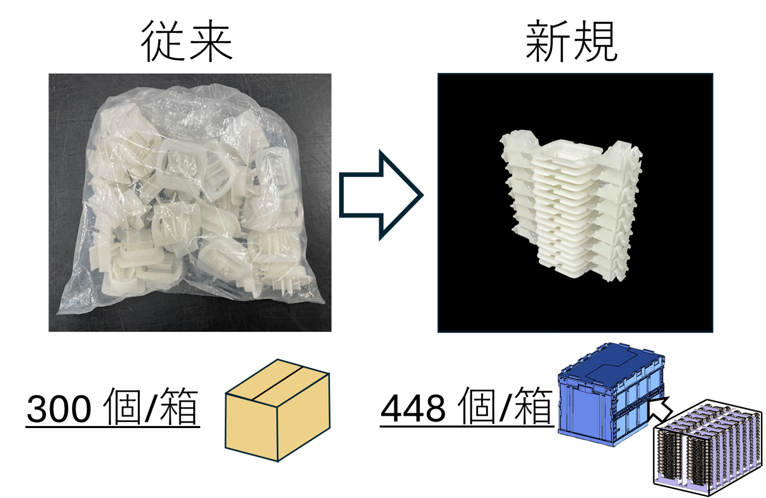 ジョイントパーツを重ねる事ができる形状にすることで、無駄な空間をなくし輸送箱に多くのジョイントパーツを詰め込むことが可能になり、輸送効率を大幅に改善しました。これにより輸送効率も大幅に向上し、さらに輸送時のCO2削減にも大きく貢献しました。