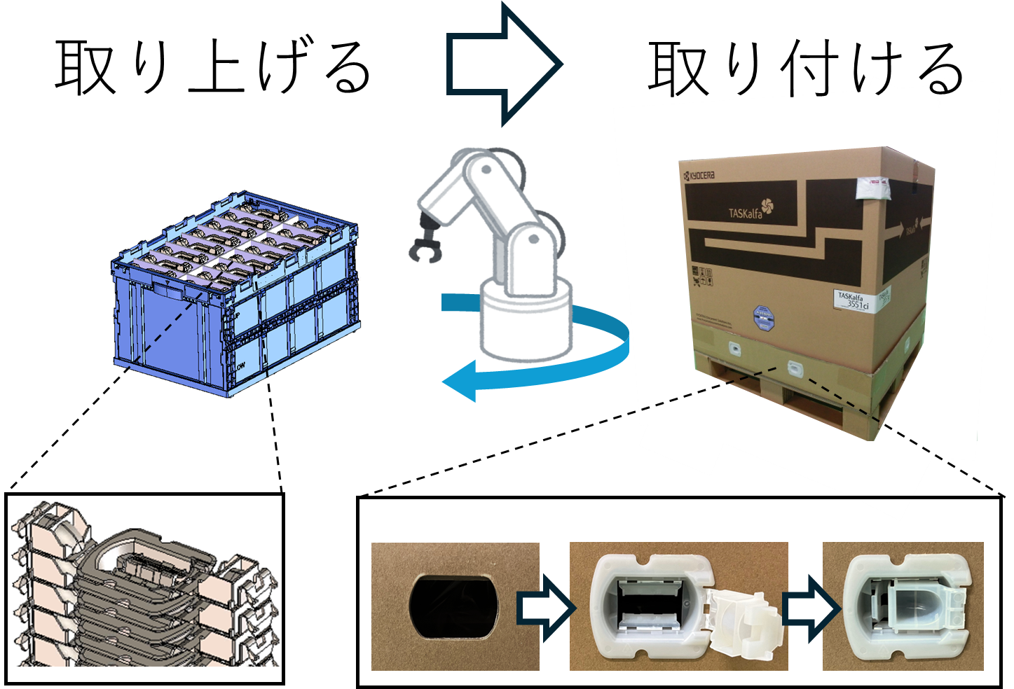 ジョイントパーツを重ねた状態で工場に納品できるようになったことで、部品の取り出しが容易になりました。それにより組立を自動化することができます。