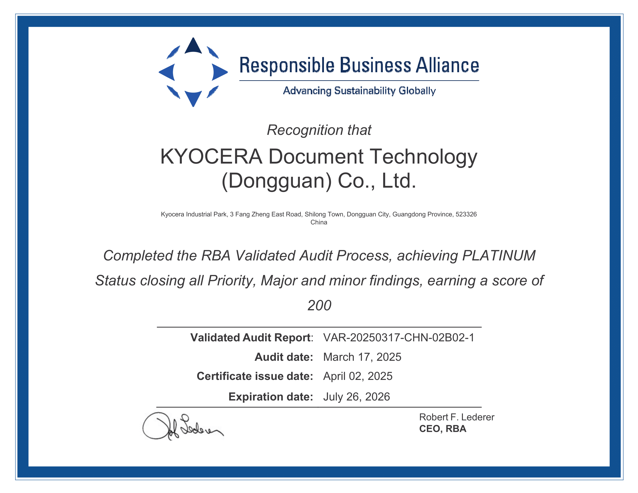 京セラドキュメントソリューションズ株式会社(社長:長井 孝、以下:当社)は、Responsible Business Alliance(RBA)のValidated Assessment Program※(VAP)監査プログラムにおいて、京セラドキュメントテクノロジー石龍(以下:中国工場)が当社グループで初となるプラチナ認証を取得したことをお知らせいたします。