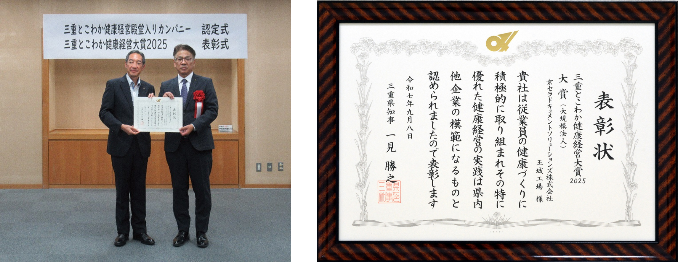 京セラドキュメントソリューションズ株式会社 三重・玉城工場(工場長:木元 恵三、以下、当社)は、2025年8月26日に三重県が推進する「三重とこわか健康経営大賞2025」を受賞したことをお知らせします。